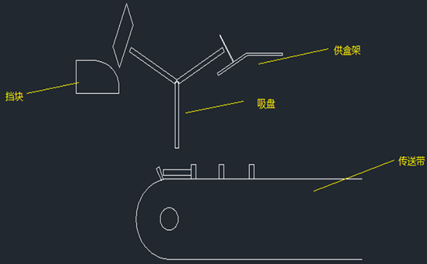 该纸盒撑开机构的过程是:吸盘逆时针旋转(约30°)到供盒架处,吸住纸盒的一侧,将其从供盒架吸出;之后吸盘带着纸盒继续旋转120°,纸盒的侧面碰到挡块,在挡块的挤压作用下,纸盒顺势滑下,从而处于半撑开状态。最后当吸头转到传送带的正上方,真空吸头通气,释放纸盒到传送带的卡槽中,运动中卡槽的一侧将纸盒向前挤压,使纸盒处于完全撑开状,供后面装入食品使用,这样就完成了整个取盒动作。