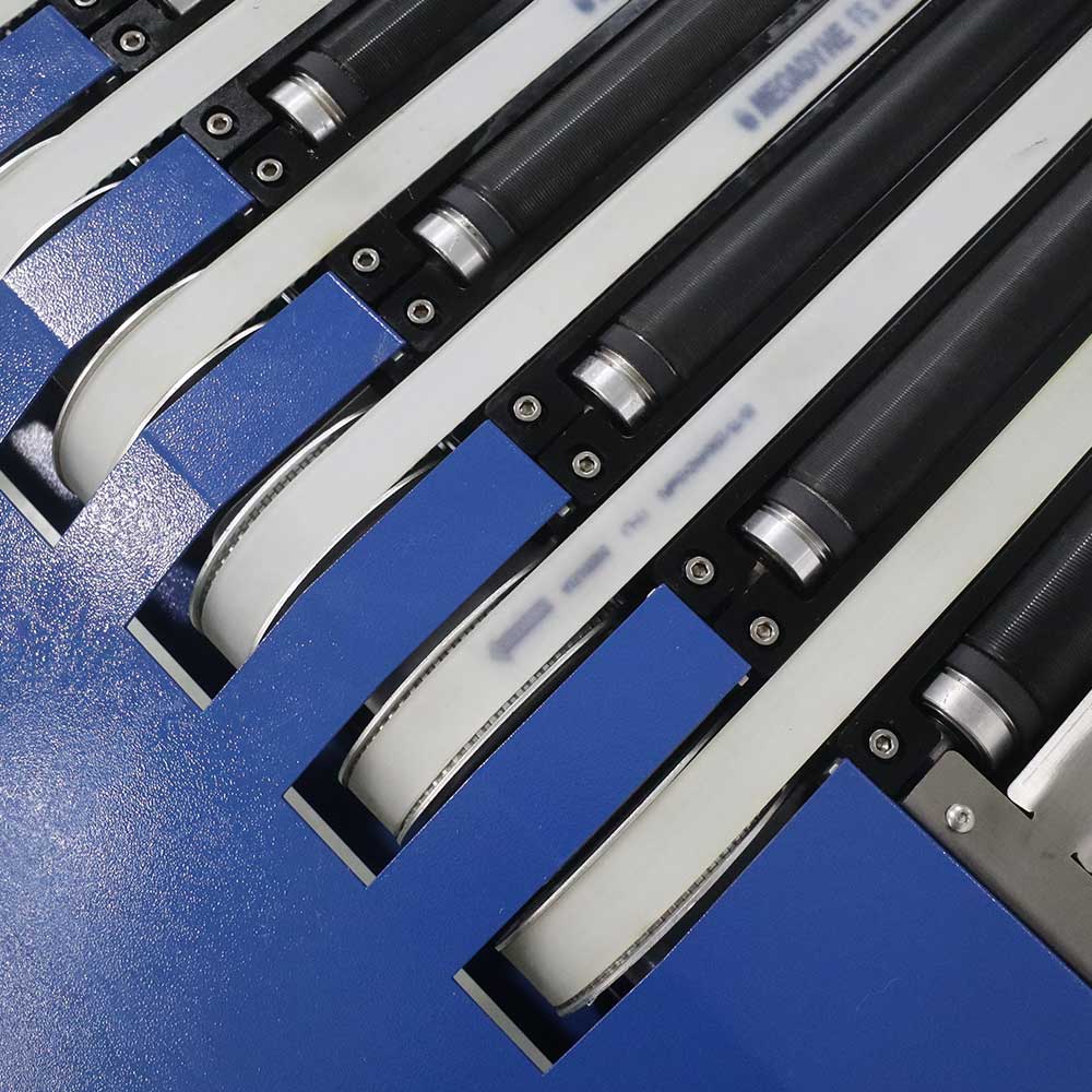 窄带分拣机主要有窄带输送和顶升移载两个系统组成,输送物置于窄带上,跟随窄带移动,在达到需要分拣的位置时,顶升移载机工作,辊筒从窄带之间升起,顶起输送物,辊筒转动,输送物沿着辊筒转动方向分拣出去。